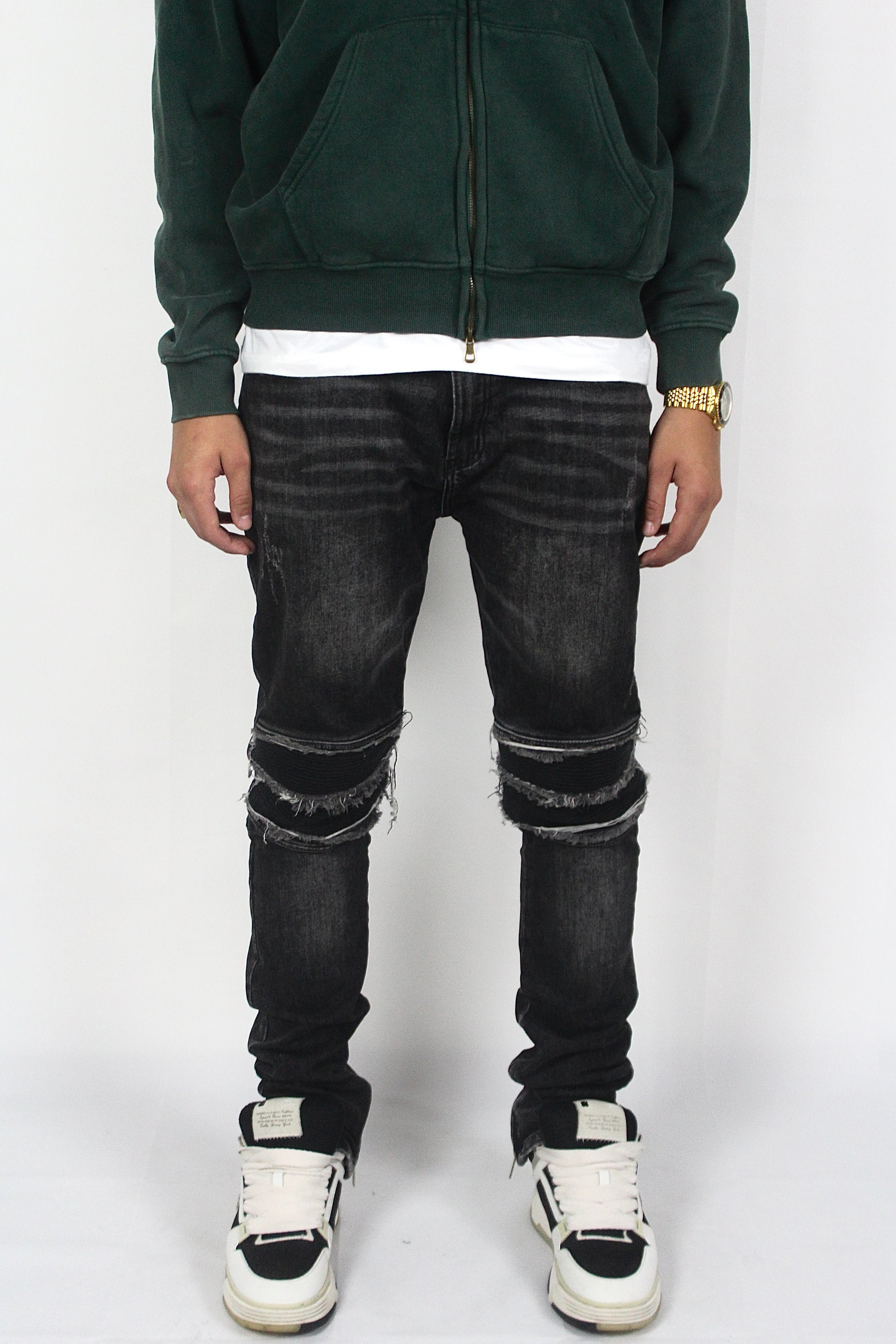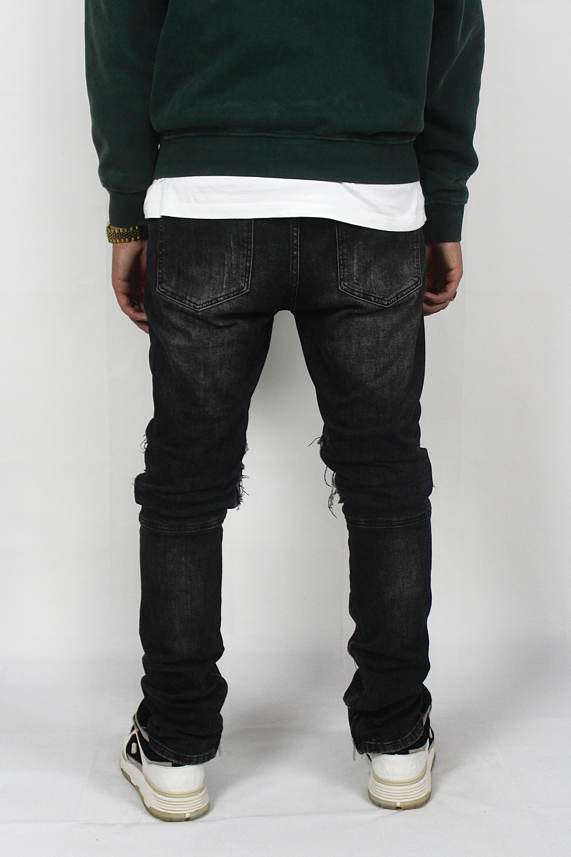 Details: Gescheurde knieën, ritssluitingen, vintage black wash